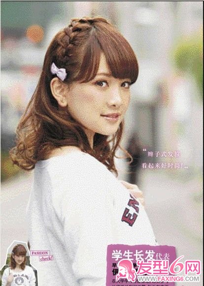 将7部分的发束在颈部发际处固定,用后面的头发隐藏住。三编辨的编织头稍微拉松,随意的制造粗度。