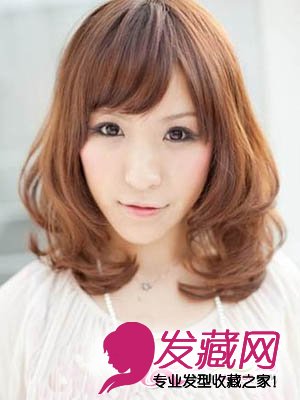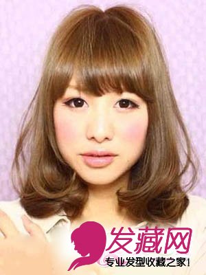 可爱的齐刘海下透露出了女生乖巧可爱的电眼,同样是中长发的长度营造出来的是更多甜美以及可爱的味道!仅仅将发梢打造出内扣的弧度,有点梨花头质感的卷发与脸颊的线条完美结合,瘦脸的同时也能够让女生的脸型更加接近V型,利用齐刘海的发型设计,甜蜜可人!