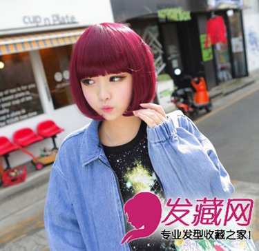 齐刘海的俏皮波波头,绚丽的酒红色挑染,简单的发型设计,可爱度和时尚大增,十分抢镜。