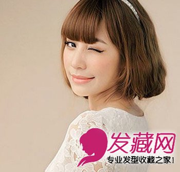 充满韩国气息的一款齐刘海波波头,中长的长度干练中又不失女人味,整齐的小刘海遮住额头,搭配发饰,彰显出可爱甜美的气息,微卷的发丝,自然中带着点随意。