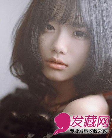 这款也是纯黑色短发,底部卷发增加了发量的丰盈度,稀薄的齐刘海搭配一旁的头发显得脸型很小,看上去清纯可人。