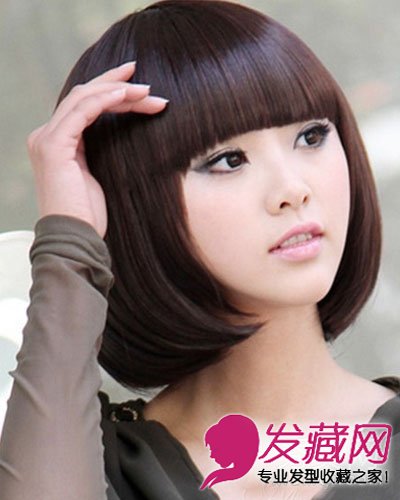 圆滑弧度修剪的经典波波头短发,内扣式的发尾,打造精美小脸蛋,来个整齐厚感的刘海,同时倍增韩式甜美优雅美态。