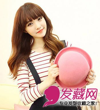 栗棕色的韩式卷发甜美时尚,萌动的齐刘海,白嫩的脸蛋可爱淑女,横条纹衬衫穿搭黑色背带裙,可爱俏皮适合小个子的女生。
