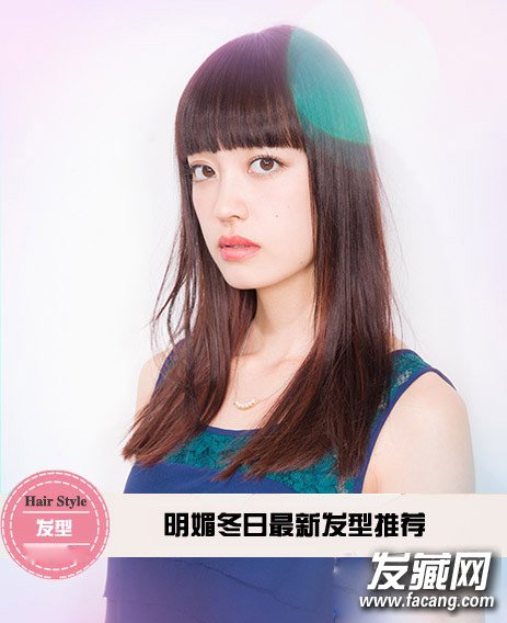 打造出完美的日系东洋风。整齐的刘海遮盖住整个额头,与长直发完美搭配,打造出干练气质。