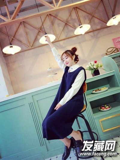 清爽可爱的丸子头扎发,空气刘海栗色的染发很显清纯气质,学院风清爽减龄。