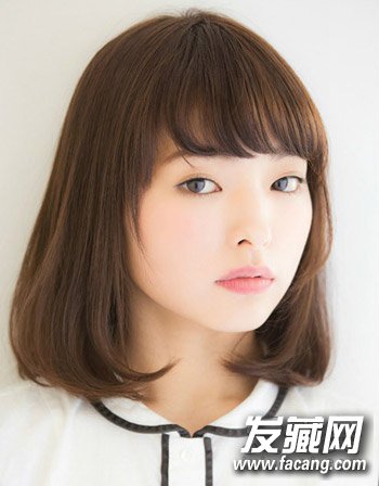发型点评:别致的斜刘海打造出碎发效果的设计,隐约露出的眉毛清新感十足。及肩的内扣波波头优雅修颜。