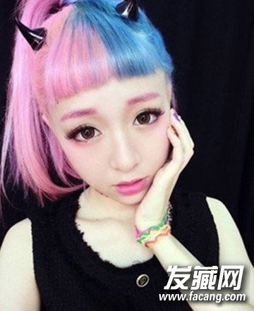 碎碎修剪在眉毛之上的齐刘海,挑染粉红色和蓝色,凸显五官,又显得非常精神,粉红色和蓝色的染发,搭配个性黑色小背心,很有原宿风的感觉。
