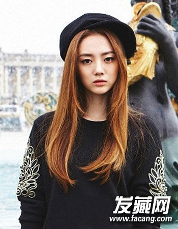 明亮的橘黄色染发颜色一来可以衬托出女生肤色的白皙感,二来还可以增添女生十足的潮流气质感,搭配韩式中分形式的长直发更添魅力街拍范儿。