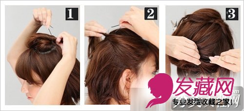 Step2: 将耳朵以上额头两侧的头发分别顺时针转半圈后超发顶中部拉拢,用发卡固定。