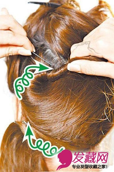 Step2最下方头发顺时针往左耳耳垂扭转,用夹子固定;中段头发抓到左边,向上扭转并夹好固定。
