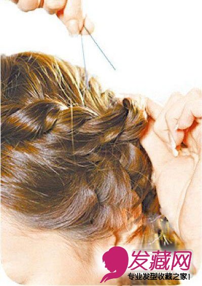 Step5最后把最上方的头发往左下方编成辫子,仍固定在与step3同一处,并夹上水钻发夹即完成。