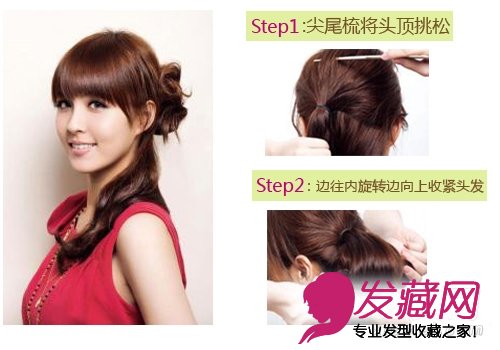 1. 头发分上下两部分,上半部绑成斜一边的公主头,绑好后用尖尾梳将头顶挑松。