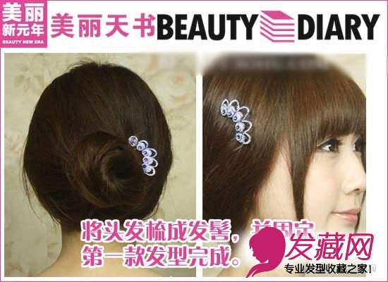 将头发梳成发髻,并用卡子固定,然后戴上漂亮的发饰,第一款发型完成啦,很简单却很漂亮。