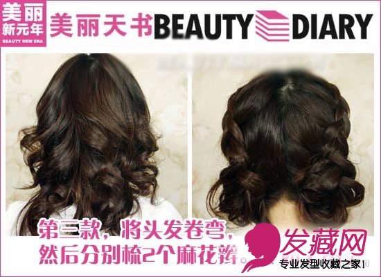 第三款,将头发卷弯,然后分别在两侧梳2个麻花辫,如上图所示。