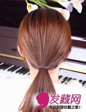 把头发理顺之后在颈部位置开始扎马尾,扎一束低马尾
