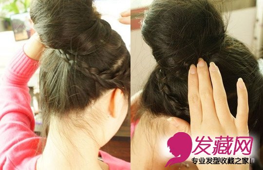 编好后将2边的辫子绕在刚才的丸子头上,绕好后用黑色的小夹子固定下发尾。
