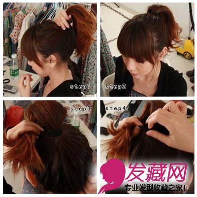 将头发高高梳起一个马尾,马尾发尾的部分握起一个拳头大的发箍。