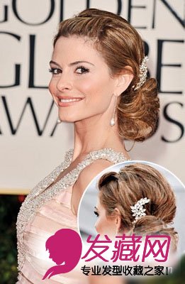 Maria Menounos 在第68届金球奖颁奖礼红毯上的造型,只需在头顶一侧用编发制造线条感,侧梳的发辫用闪亮的发饰妆点,短短几分钟就能完成。
