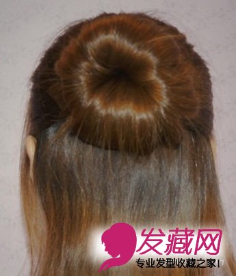 首先将头发分成两部分,上半部分用基础盘发器法梳成一个花苞 。