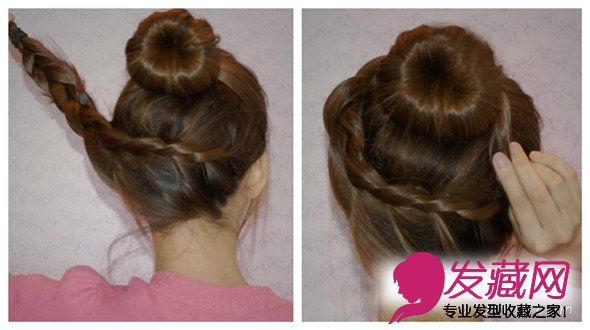 编完的头发,用皮筋扎好,卷在刚在的花苞头根部,用小黑夹固定。