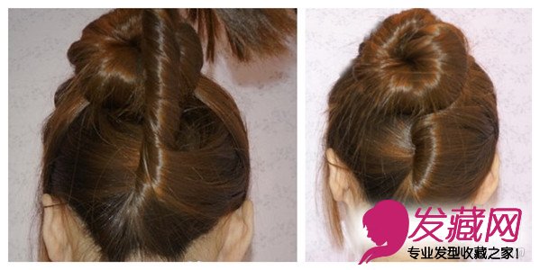 下半部分头发朝一个方向卷起。卷起的头发尾,固定在之前花苞头的根部。