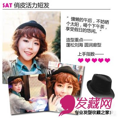 带有弧度的BOB头搭配卷发造型,小礼帽恰到好处的遮盖在刘海之上,营造出俏皮帅气的感觉。蓬松的刘海看似丰盈却不显厚重,随意抓松的小卷发,让小波浪卷更柔和,让脸庞显的小巧可爱。看似干燥的发质,感觉很微妙又显自然奔放。