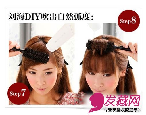 Step8: 用圆棕梳从额头以下大约2cm的位置卷起头发,一边转动滚梳向下画曲线,一边用吹风机吹刘海下半部分。