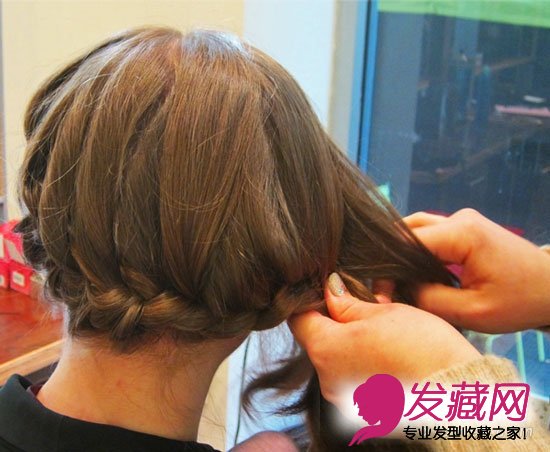 先将头发侧分,然后开始从发量较少的一边编法式麻花辫,一直编到耳朵上方为止。编发时依照头部的弧度适时改变辫子的形状。