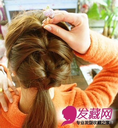 整理好头发之后,把一个套型的插针插到图片中模特示范的位置那里。