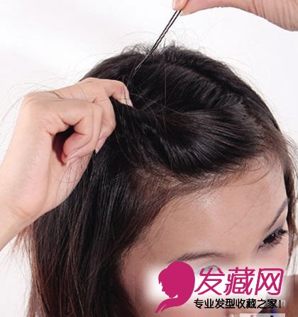 Step 5.将刘海扭成小发髻,用U型夹固定。若想要发髻更高,可扭转后稍往前推增加蓬松度
