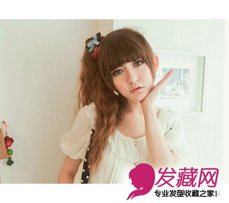 高束的卷发马尾,奶茶系的染发显青春洋溢,固定在后方的斜刘海乖巧甜美,纯色的蝴蝶结发箍搭配更萝莉可爱。