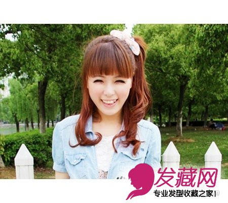 高束的卷发马尾,奶茶系的染发显青春洋溢,固定在后方的斜刘海乖巧甜美,纯色的蝴蝶结发箍搭配更萝莉可爱。
