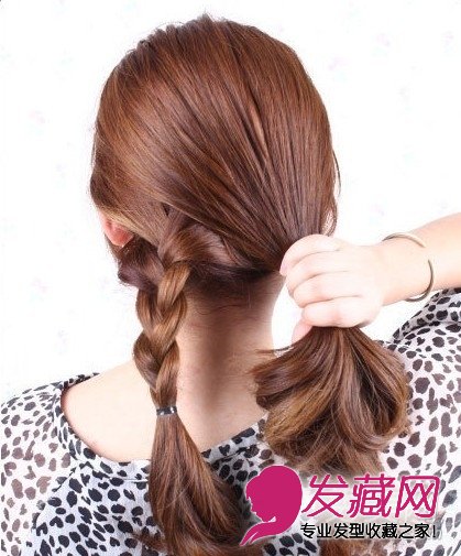 将上部分头发自然盖下来,把头发绑在右耳下。