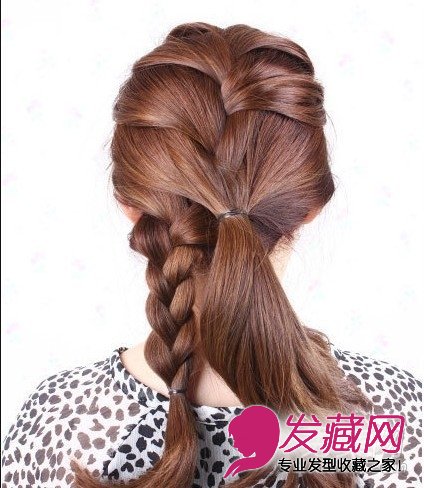 把上面部分的头发编加股辫到耳朵下方处止。(加股辫编发教程:按普通麻花辫的方法编一次,然后再取一股续编上次三股其中的一股,合成一股,始终保持三股头发,按此类推,不断按三股先后顺序续接地编。)