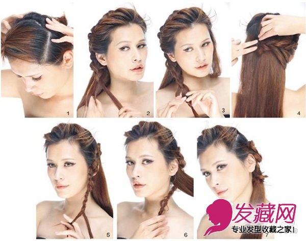 6.用这股拧好的发辫从后向前绕过剩下的头发,根据自己头发的长度决定一圈或是两圈。然后将发尾藏好固定。(图7为效果图)