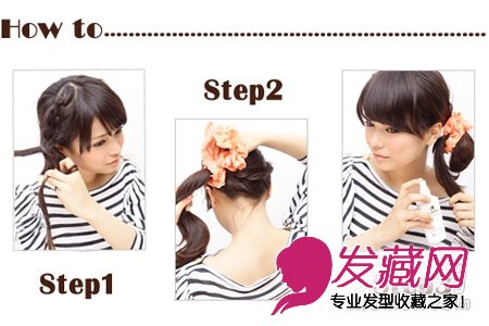 Step2:再把蜈蚣辫露在上面,加上其他头发一起绑成一个小发圈,固定在耳后。