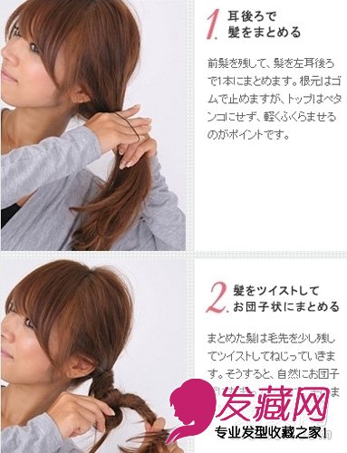 首先将头发全部固定在一侧耳后,再半折头发,然后拧转。围绕着刚才半折的部分旋转。