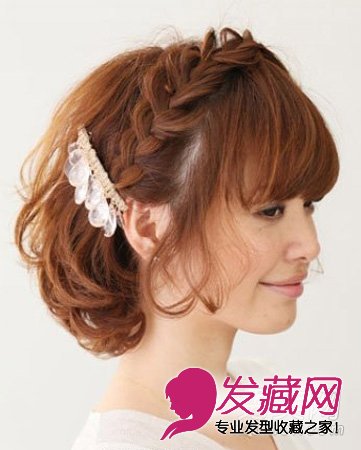从左往右头顶开始编蜈蚣辫,直到右耳耳后,以亮丽的小优雅发夹固定。