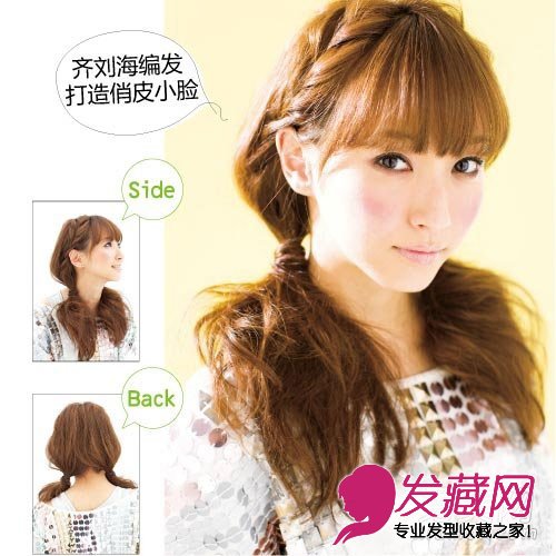 蓬松的编发样式,编织出所谓的复古俏皮范。简单的双侧马尾辫,因为编发的加入显得非常轻松自在,编发并没有怀旧到一直延续到发尾,而是在耳后停止了,显出一种别出心裁的可爱,发尾的蓬松成功吸引了视觉注意力,在大面积齐刘海的配合下,小脸指数相当高哦。