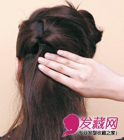 2.将这条马尾向里翻转,从下面拉出,将这部分头发和最下面的头发融为一体。