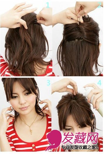 3.后脑发束发尾向上抓起,用鲨鱼夹固定,而双颊发丝则轻轻拉散,营造空气感。