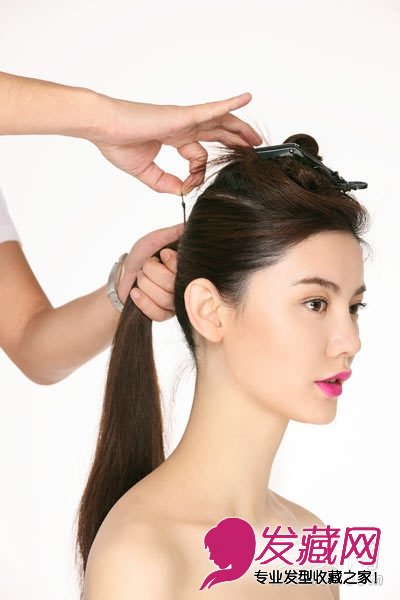 2.将U型区头发梳向一侧,并固定,将剩余头发绑成马尾。