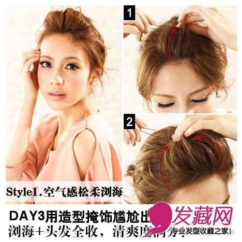 将眉毛上方的刘海,以扭转方式向后夹,秘诀是夹的时候往前推一下,即可创造空气感。