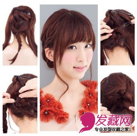 4. 将临时固定的头发放松下来,编成麻花辫。将这条麻花辫对折一下,覆盖在刚才做好的盘发基底上,多用几个夹子固定好。这时候再大致调整一下,这款发型就完成了。