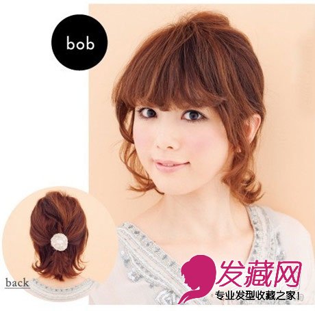 这款发型也是一款短发的扎发发型哦。将发束从3个方向取出来,是取出后面的大部分头发,然后扎在一起。想要在背影上也给人婉约温柔的感觉,那么脑勺后面中央的头发最后分2次拧在一起再扎起来。再花点工夫,将脸周围的头发用卷发棒稍微做卷一下的话,更加华丽。如果MM时间充足的话,就将后面散下来的那些头发也做卷一下吧。婉约中带点俏皮,出游时必定成为照相机的宠儿。