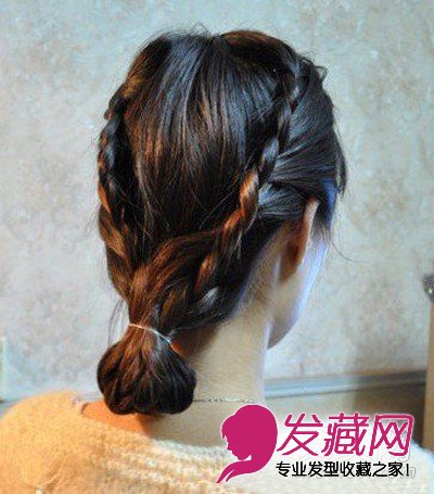 步骤七:用皮筋把上步手抓的头发固定紧实,这时头发自然的垂落在脖子的下方位置。