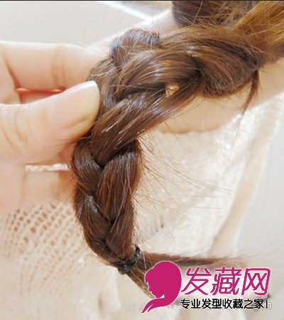 步骤五,编到后面,上方没有头发的时候,就按麻花辫的编法编,当最后剩余的头发都编完后,用橡皮筋扎起。