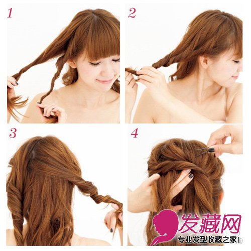 2、一手抓住扭转好的头发,另一只手再抓取耳后的一股头发,和前面2股头发合并一起顺时针扭转。