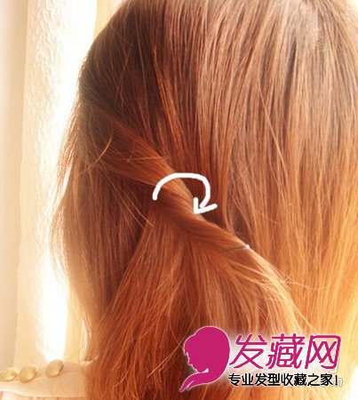 从左侧太阳穴位置,取出一撮发股,顺时针方向反转。用黑夹子固定最上侧头发。不要整股固定,剩下的就让其松散开