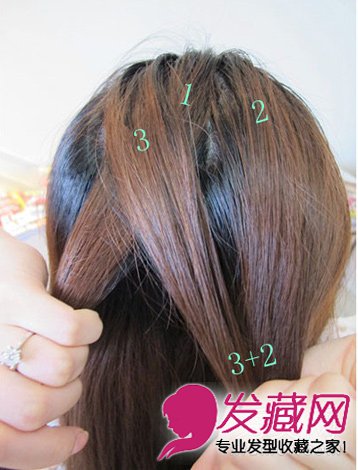 先从左边份头发的外侧取适量发束(多少根据自己喜欢,越少越好看)和右边份的头发加在一起